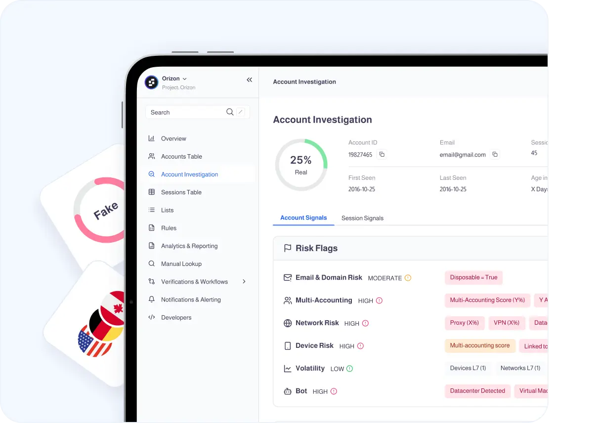 Use Verisoul as a high-quality signal layer inside your existing fraud and risk models. Incorporate our identity, device, network, and location signals to improve scoring accuracy.