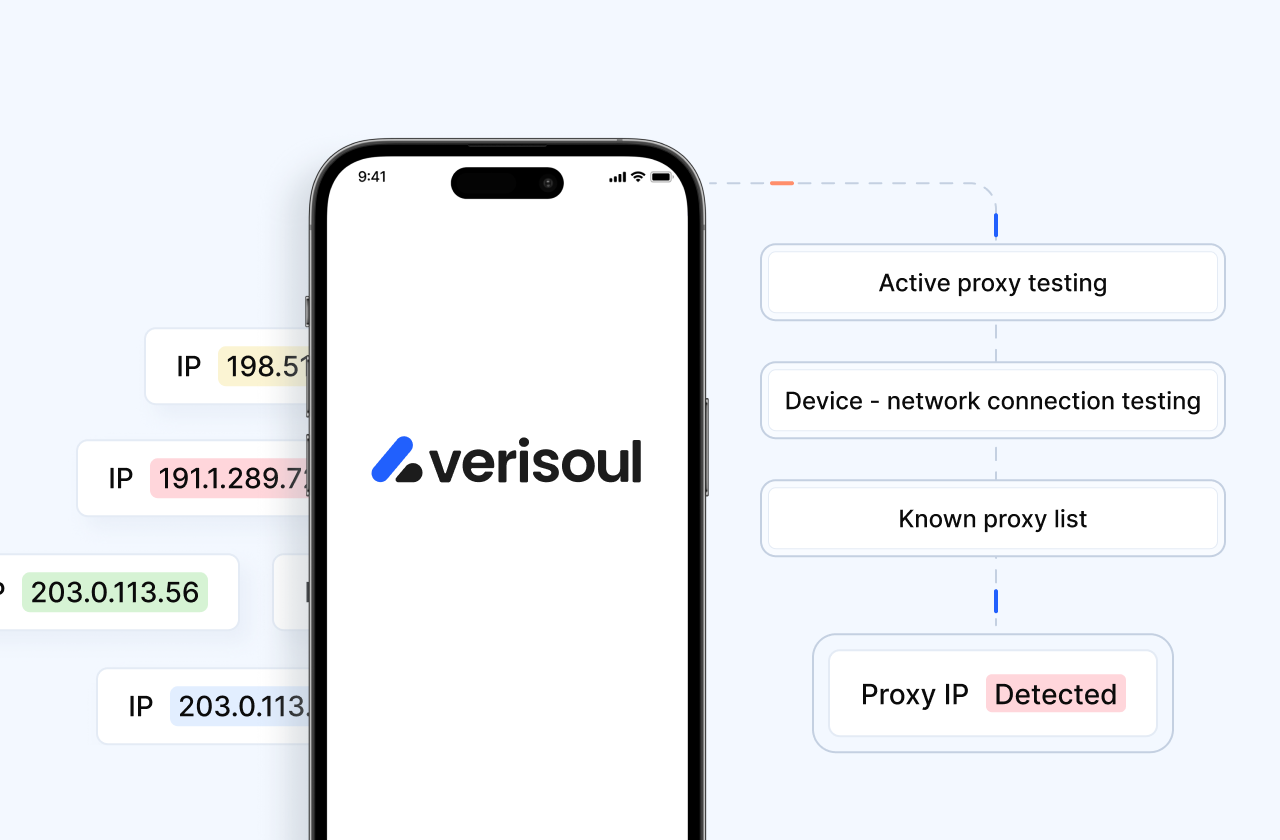 Identify mobile proxies, residential proxies, VPNs, and location spoofing. Verisoul uses active network forensics and device context to validate true location