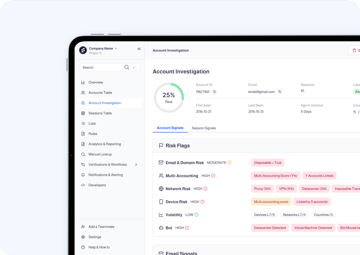 Verisoul runs passively using client-side device and network signals, so legitimate users continue through the funnel normally while high-risk traffic can be blocked, throttled, routed, or flagged based on your policies. This is especially important for ad networks and offerwalls where any added friction can reduce CTR, CVR, and revenue per session.