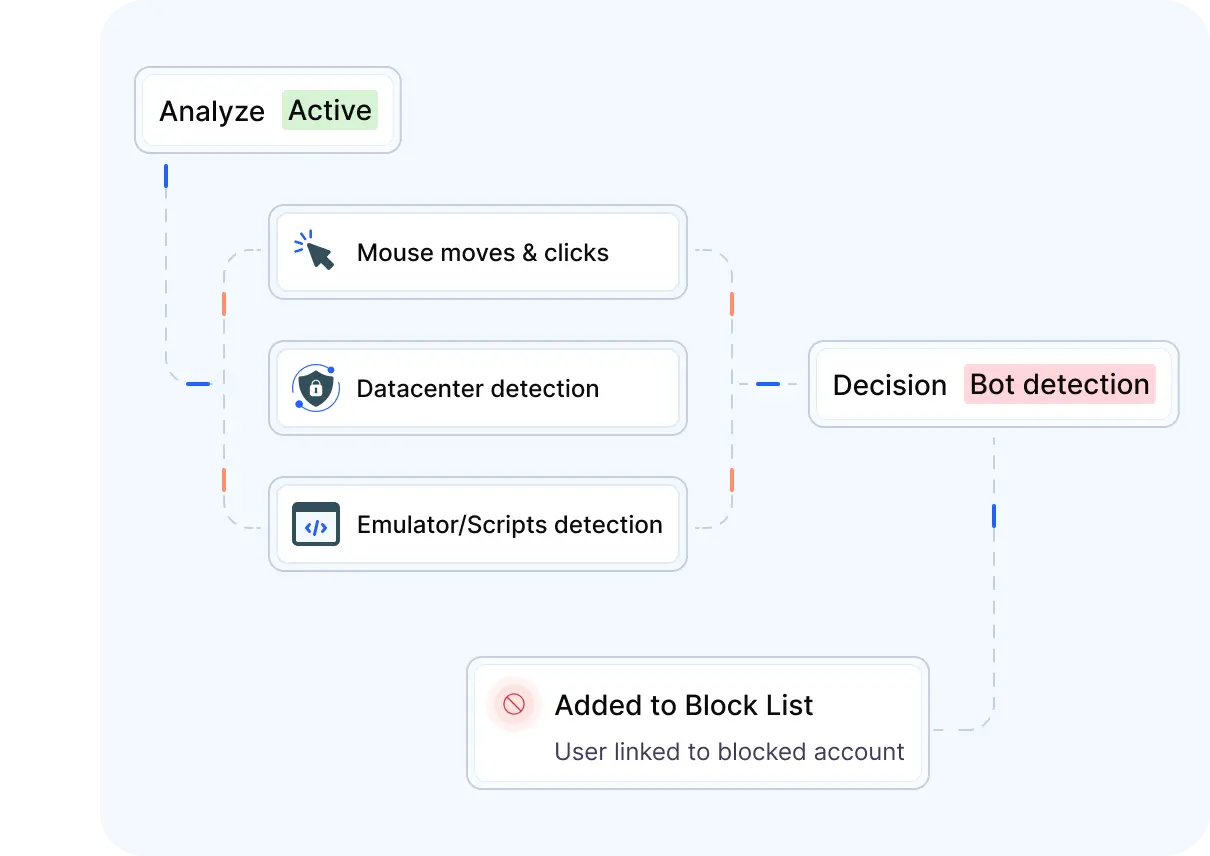 Identify bots, synthetic identities, and incentive abusers early. Verisoul evaluates identity, device, network, and behavioral signals during onboarding so only legitimate users progress to costly KYC and document verification.